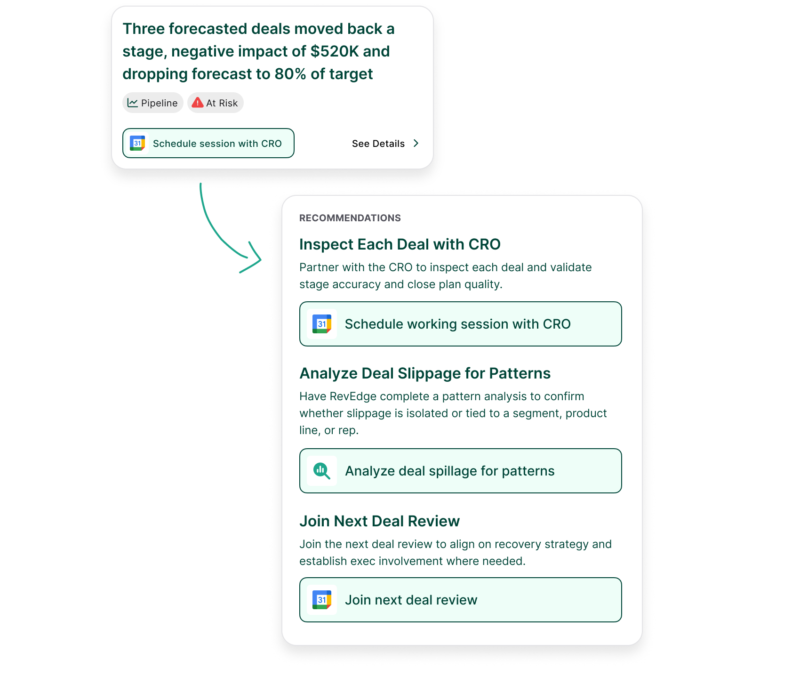 RevEdge monitors new opportunity volume and stage-by-stage conversion to spotlight emerging slowdowns, stuck stages, and at-risk pipeline segments that require immediate intervention—giving leaders an early warning when future pipeline health and forecast reliability are at risk.Deals